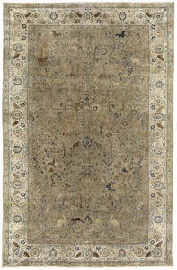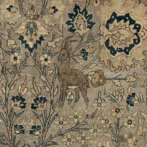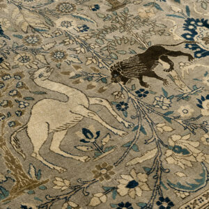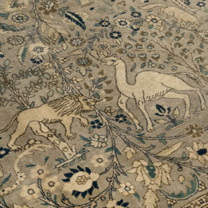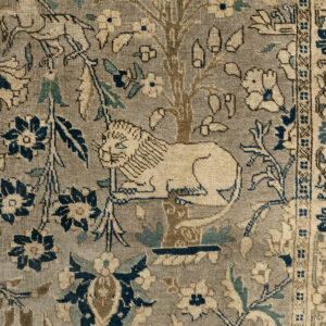 The tradition of animals in a dense forest as a Persian carpet design goes back to the sixteenth century and is one of the main inspirations in the revival of rug weaving in Iran, especially Tabriz in the northwest, beginning in the later nineteenth century. The subdued greyish mauve ground is inhabited by a veritable menagerie of wild beasts: lions, dromedary camels, bears, gazelles, cranes beavers, rabbits and tree climbing leopards. The designers were obviously working from illustrated books on animals. The beaver is not native to Persia, but is purely North American. The fauna cavort, climb, rest and stalk in a forest of flowering trees, palmettes, vines, shrubs and rosettes. The straw yellow main border continues the wild beast theme with panthers and wild asses among lancet leaves, complex palmettes and elaborate rosettes. Animal combats, frequent in other “Paradise Park” carpets, are absent here. As with Tabriz carpets of this period generally, the pile is short and erect, the weave is quite close and the foundation is all cotton.