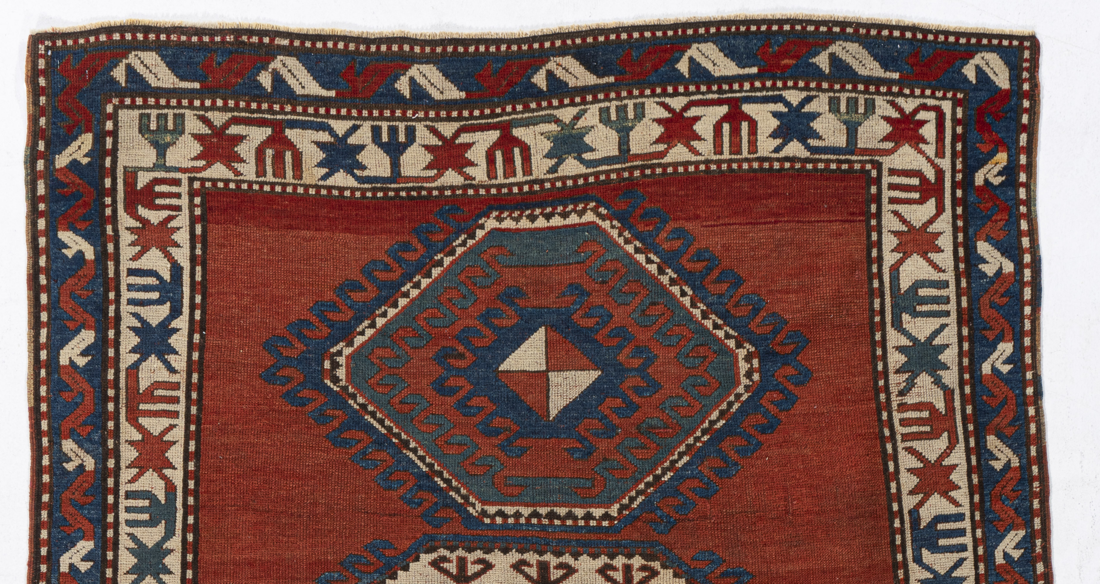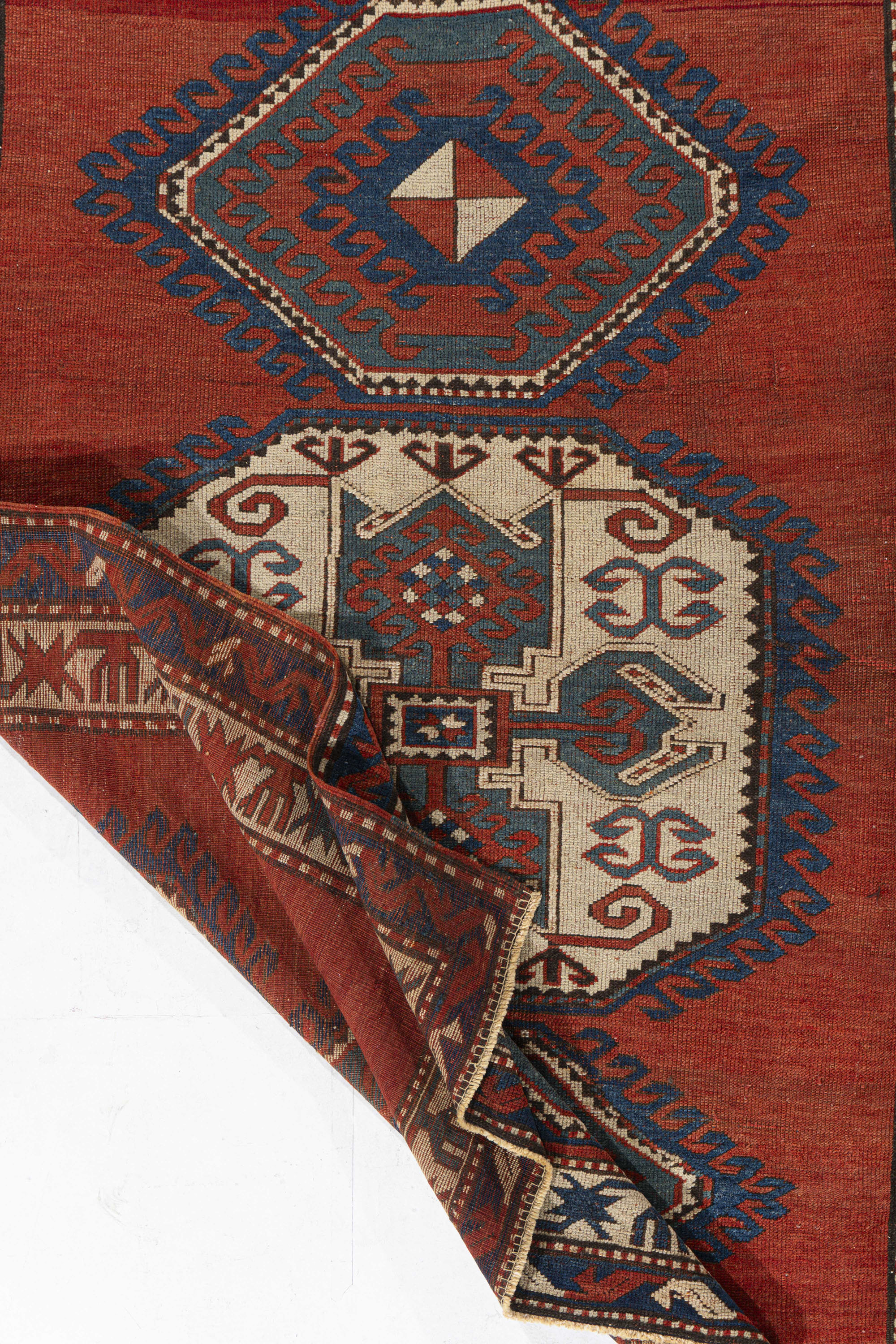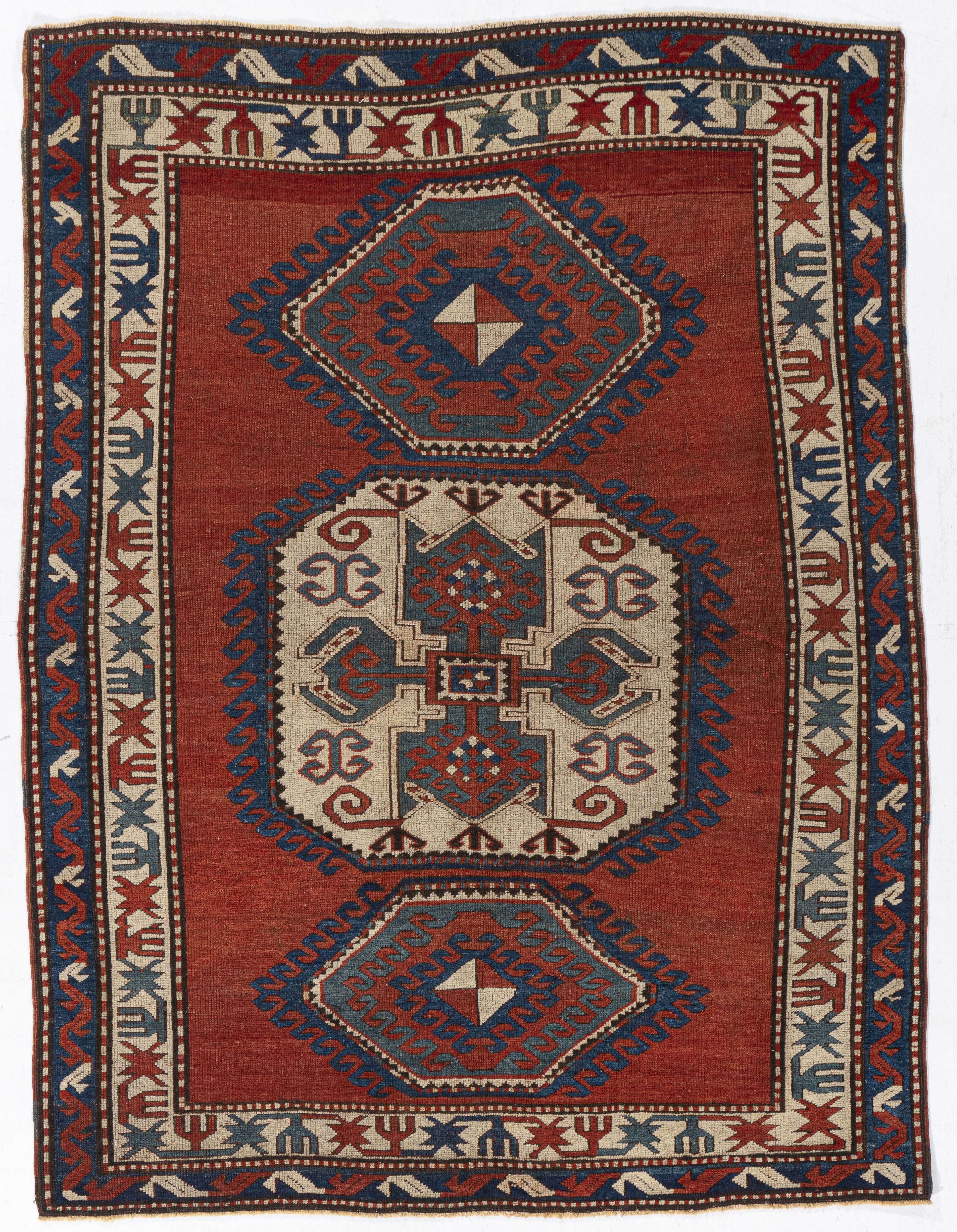 Antique Red Caucasian Kazak Rug Caucasian carpets and rugs are primarily made in villages, rather than in cities. They are made from materials particular to individual tribal provinces, the rugs of the Caucasus normally display bold geometric designs in primary colors. Hand-knotted in the Caucasus Mountains circa the early 1900s using hand-spun wool and natural dyes. From the SW Caucasus, expect lush, high pile rugs; eye catching, vigorous geometries; and broad areas of brilliant natural dyes. Kazak rugs are the sine qua non of antique Caucasian rugs. Colors: reds/ivory/blue/brown.