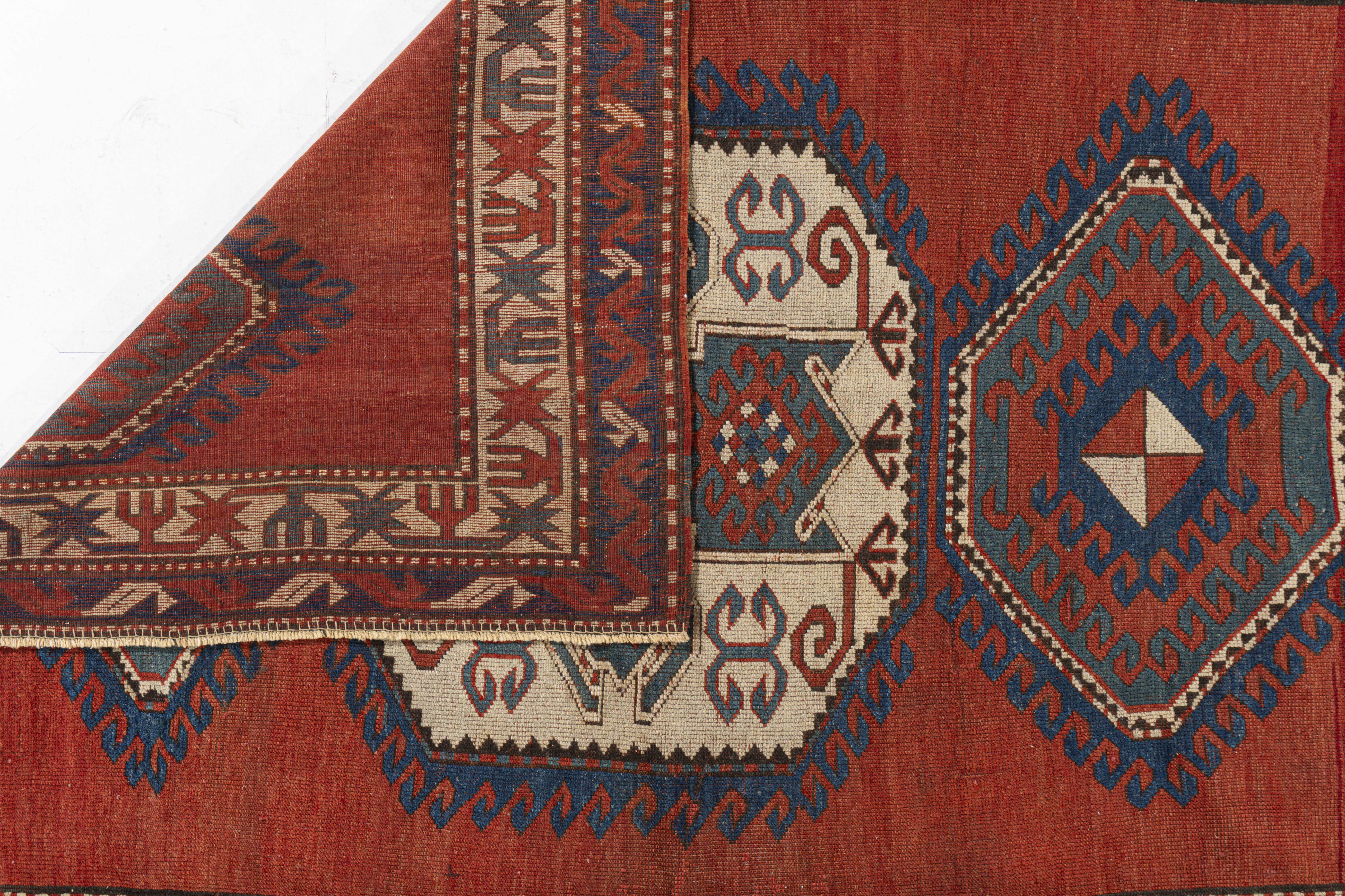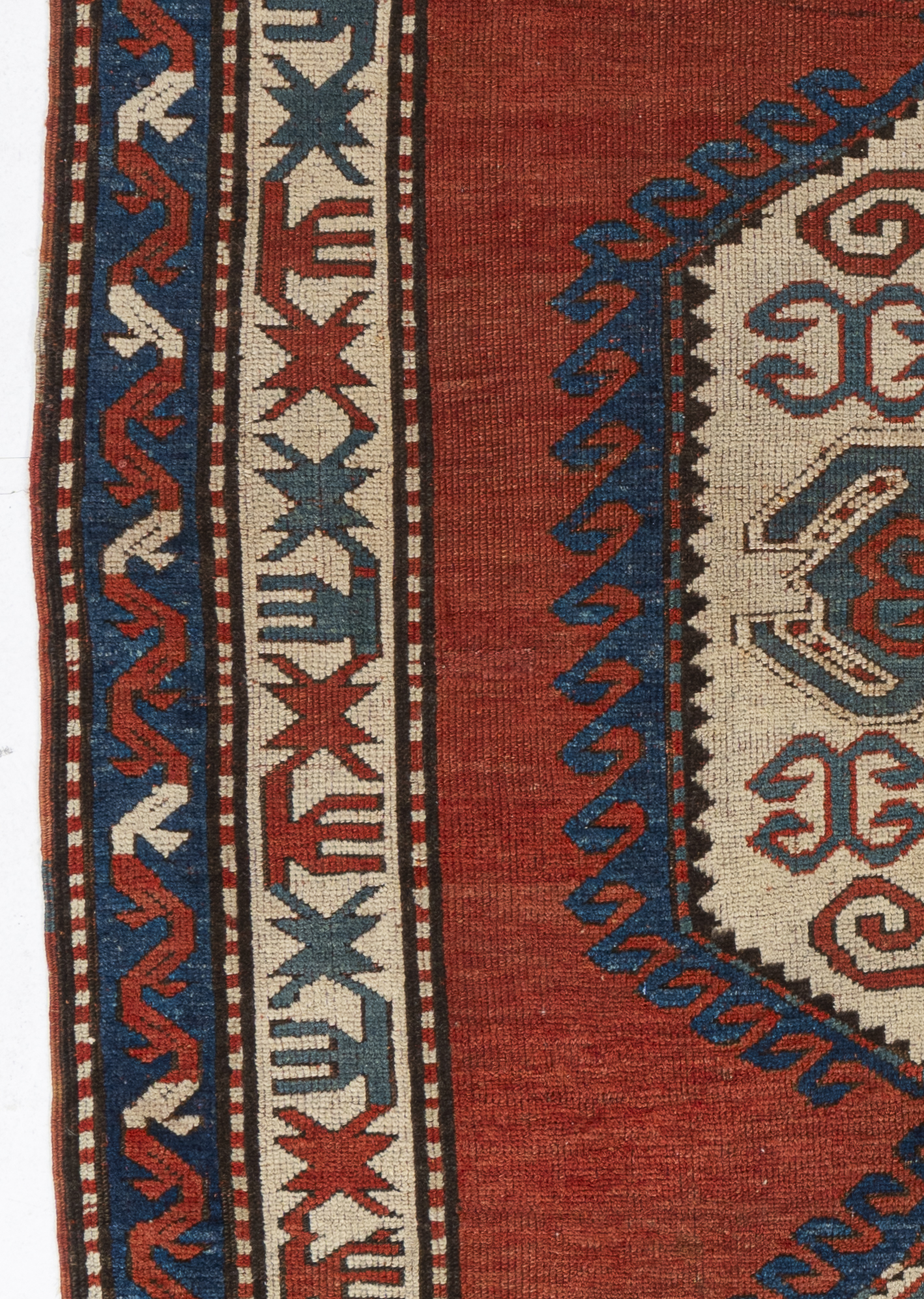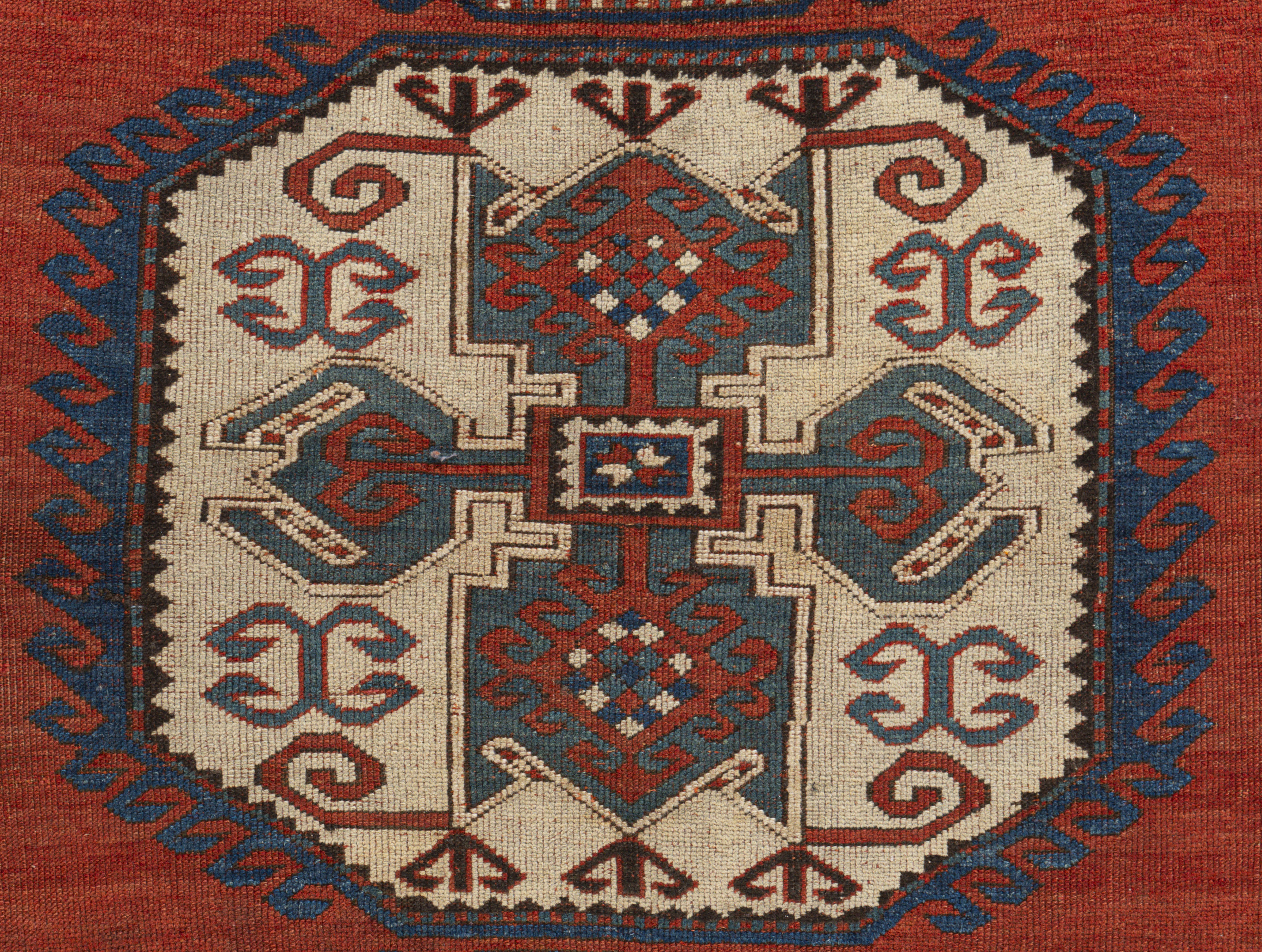 Antique Red Caucasian Kazak Rug Caucasian carpets and rugs are primarily made in villages, rather than in cities. They are made from materials particular to individual tribal provinces, the rugs of the Caucasus normally display bold geometric designs in primary colors. Hand-knotted in the Caucasus Mountains circa the early 1900s using hand-spun wool and natural dyes. From the SW Caucasus, expect lush, high pile rugs; eye catching, vigorous geometries; and broad areas of brilliant natural dyes. Kazak rugs are the sine qua non of antique Caucasian rugs. Colors: reds/ivory/blue/brown.