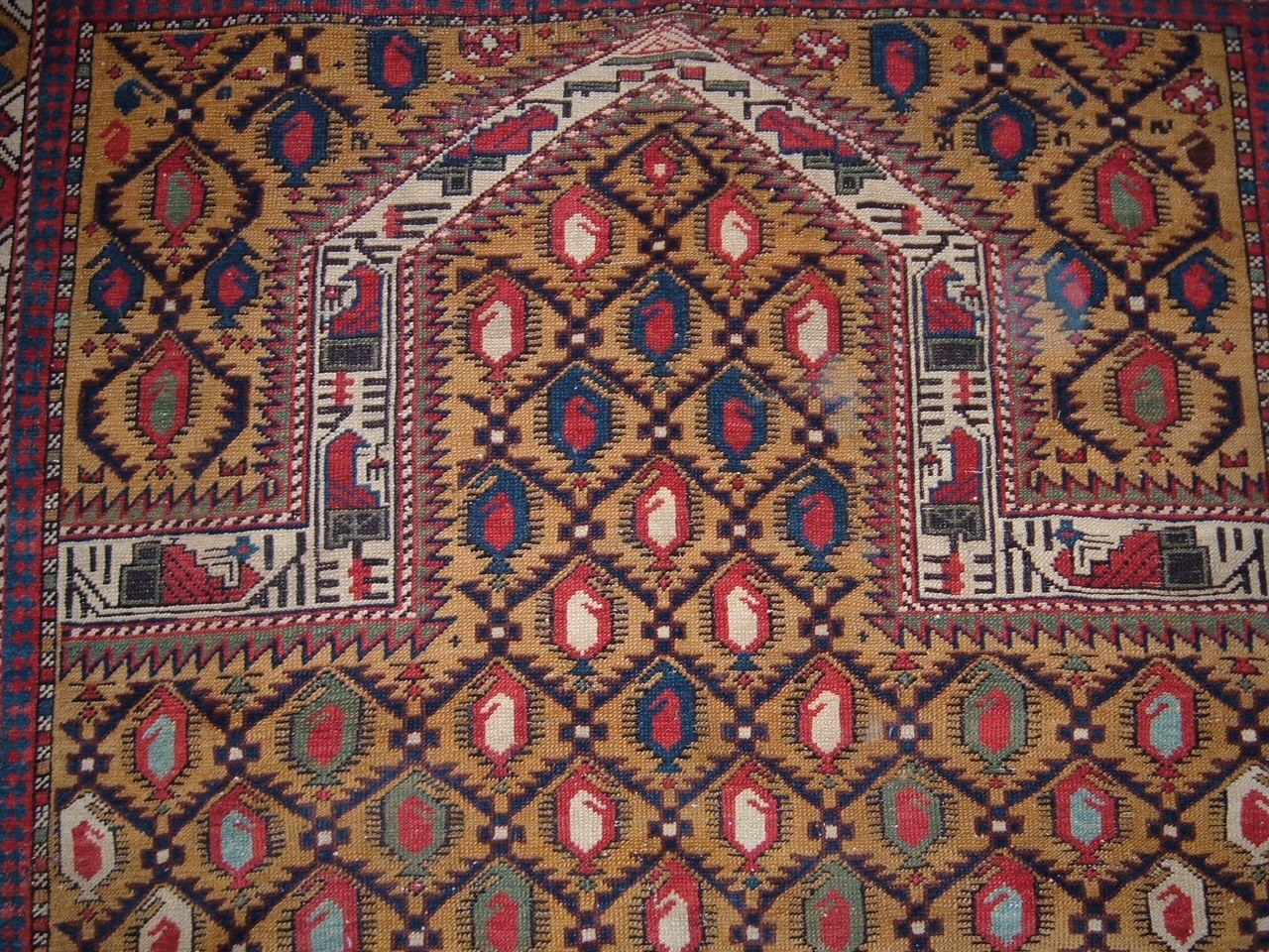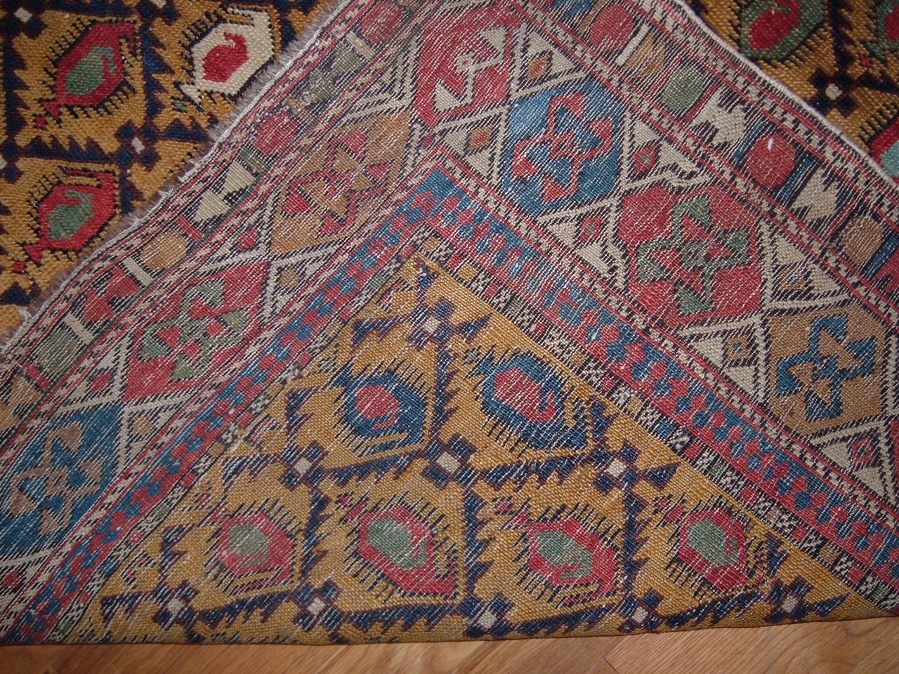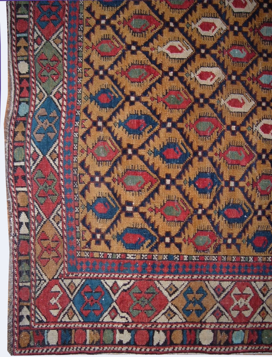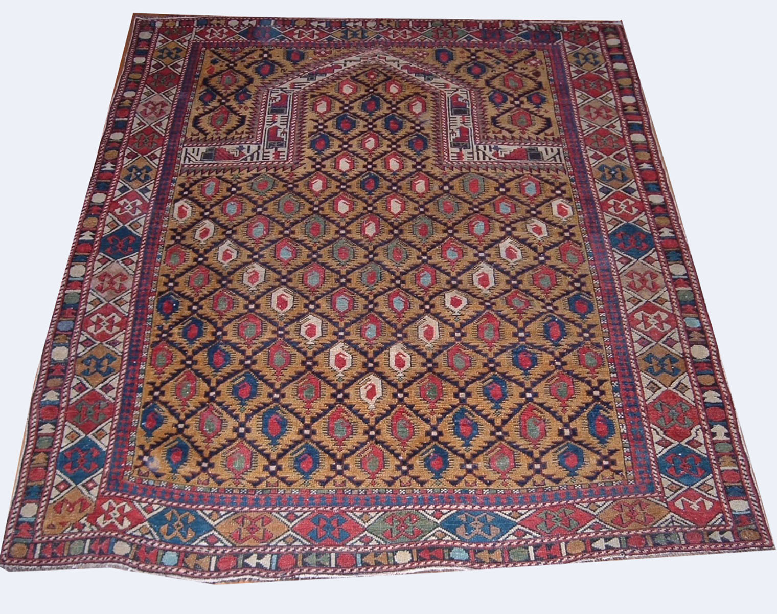 Antique Caucasian Shirvan Marasali 4' x 4'10. A Caucasian Shirvan rug from the town of Marasali which is closely associated with the production of prayer rugs having refined field patterns often in a structured vinery lattice. Colors: gold/blues/greens/brown/ivory/multi.