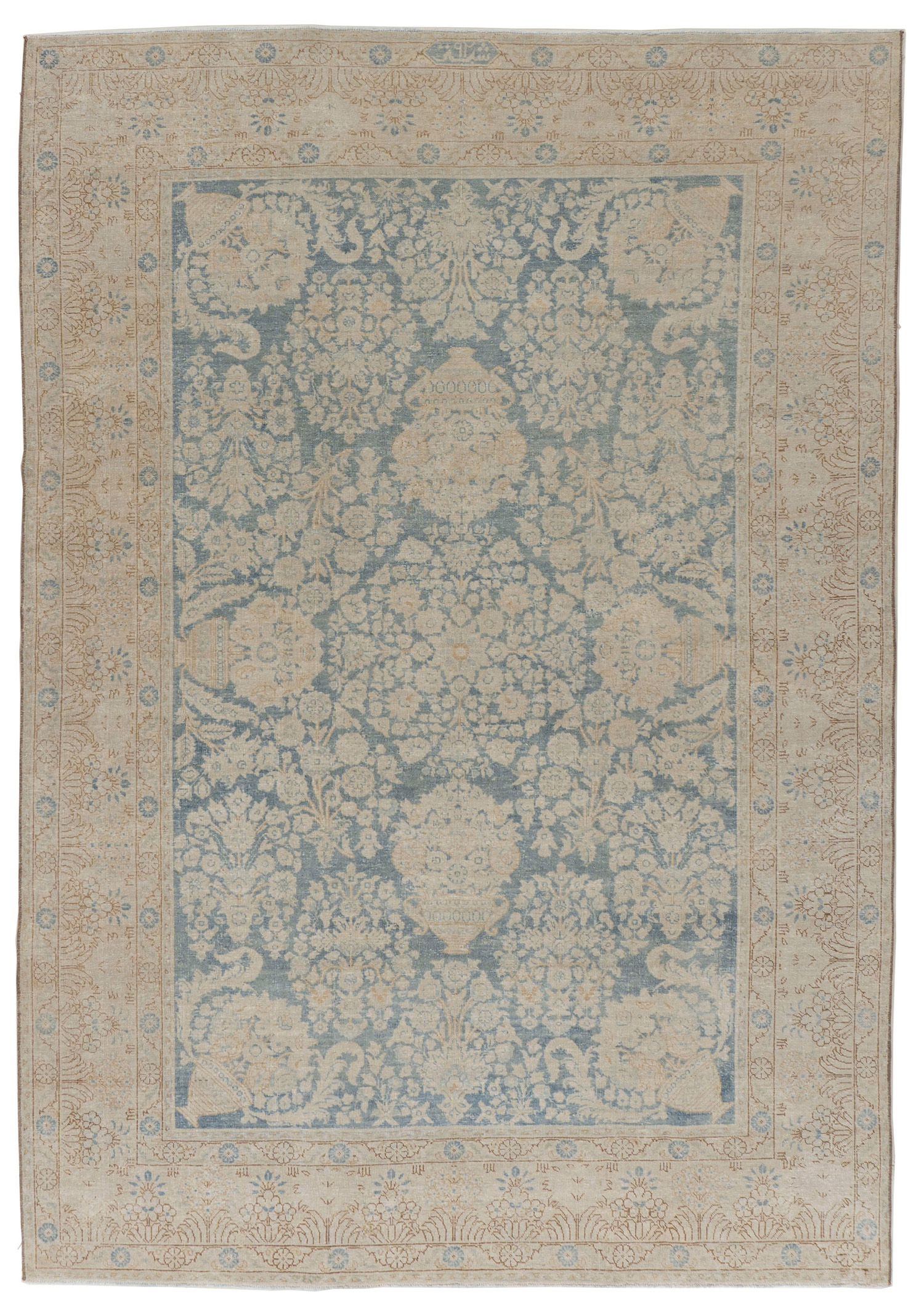 Antique Subdued Tabriz Rug 6'7 x 9'7. Tabriz means many things to rug enthusiasts: classical antique Persian carpets of the 16th century now in museums, decorative medallion carpets from the 19th century popular with designers worldwide, fine quality silk rugs as much wall hangings as floor coverings, and medium-priced goods for the middle market. The Persian carpet revival began in Tabriz around 1870 and Tabriz carpet merchants were instrumental in the renaissance of the craft throughout Iran. Because Tabriz has always been an important Persian industrial center. Tabriz carpets are always regularly woven, well drawn and evenly dyed. There are no loose cannons on the Tabriz ship of weaving. There is a Tabriz carpet for any pocketbook, any decorative style, any room, any taste. Colors: blues/beige/tan