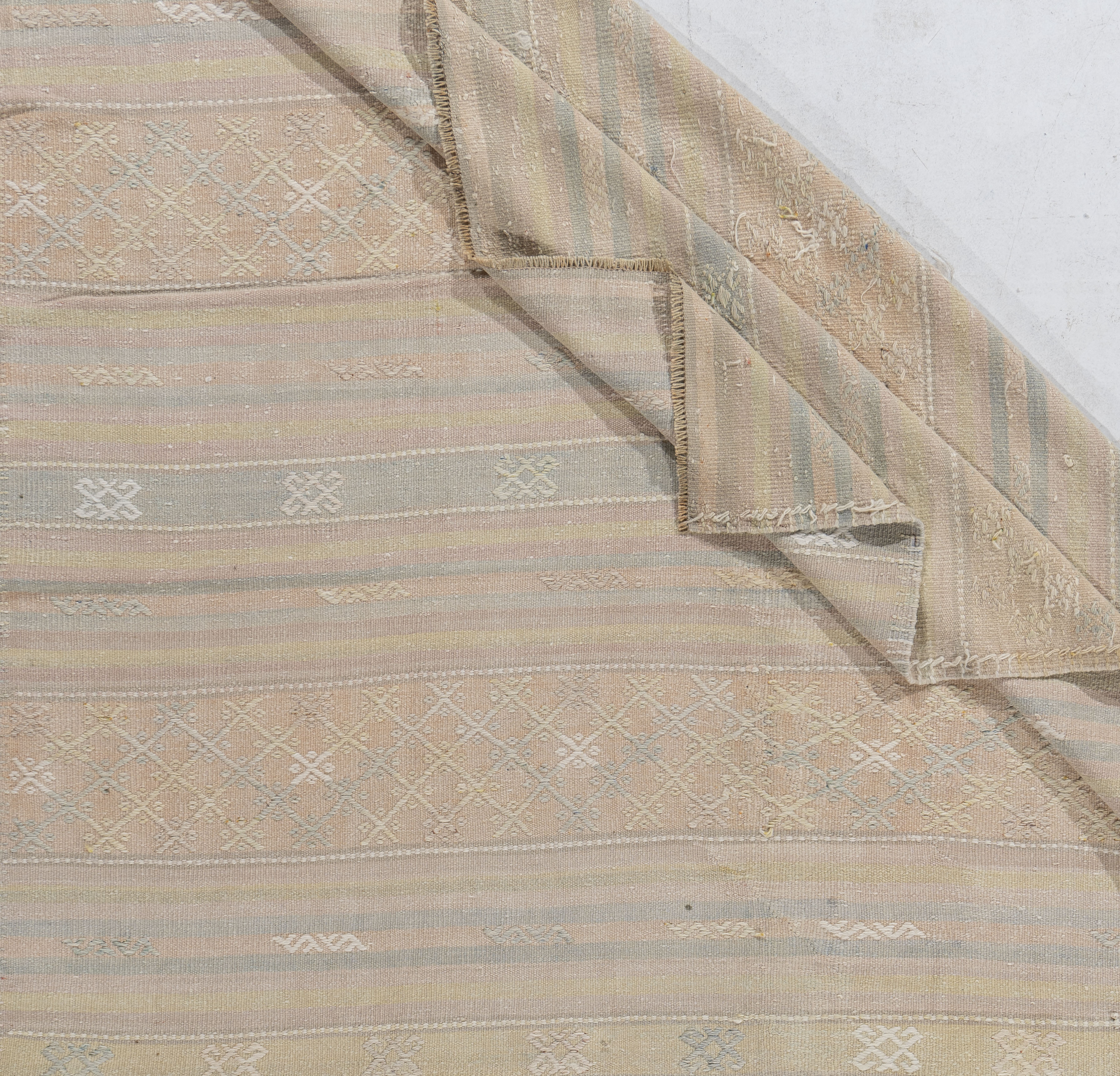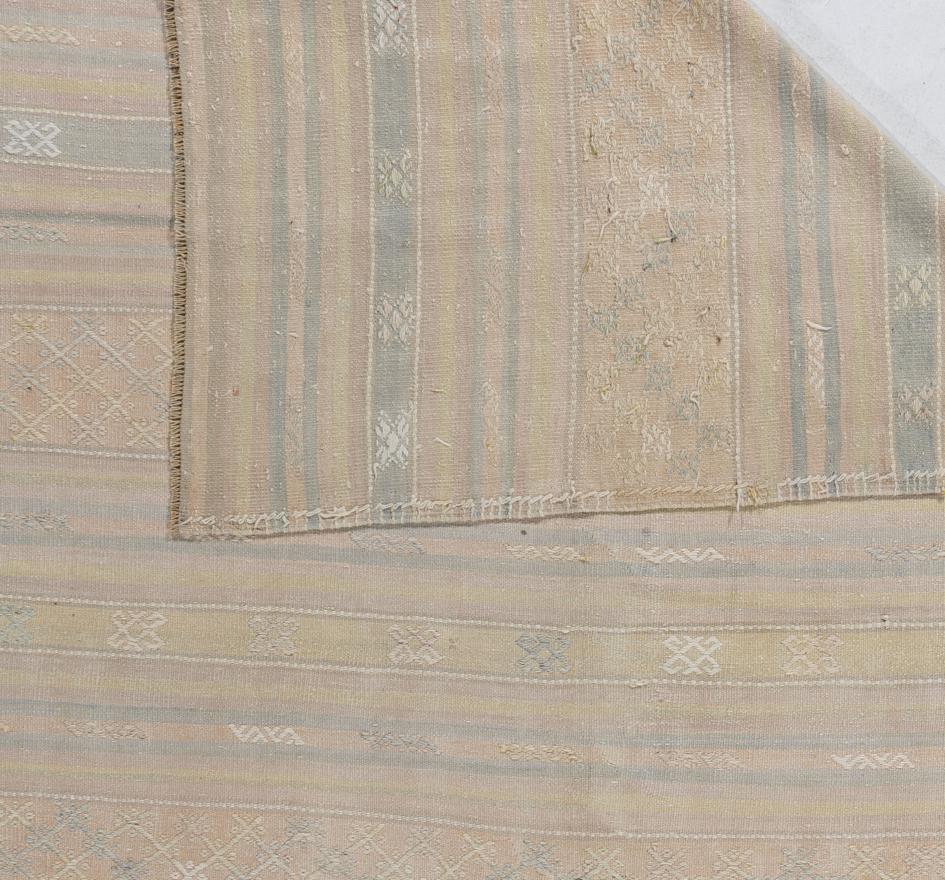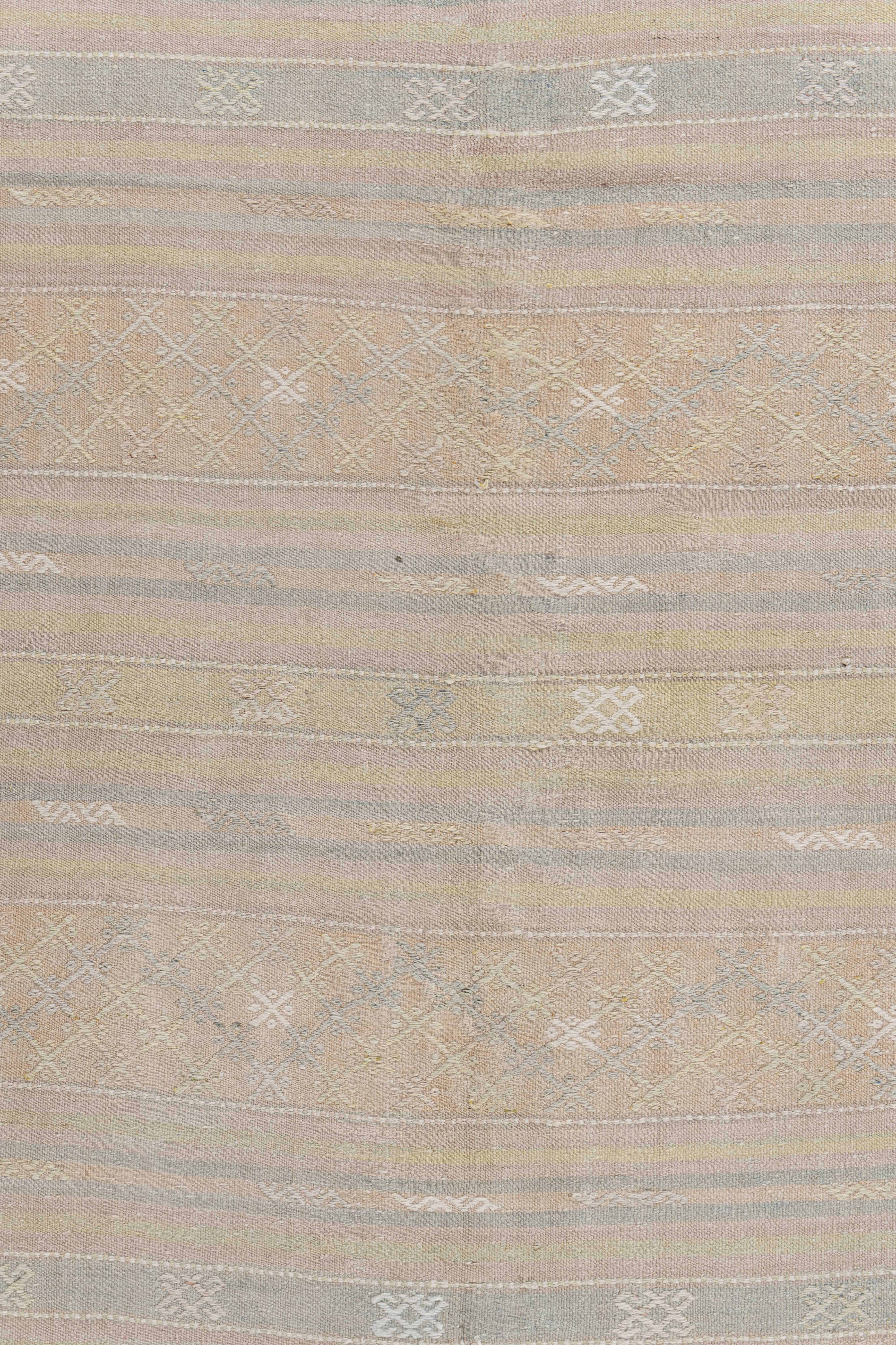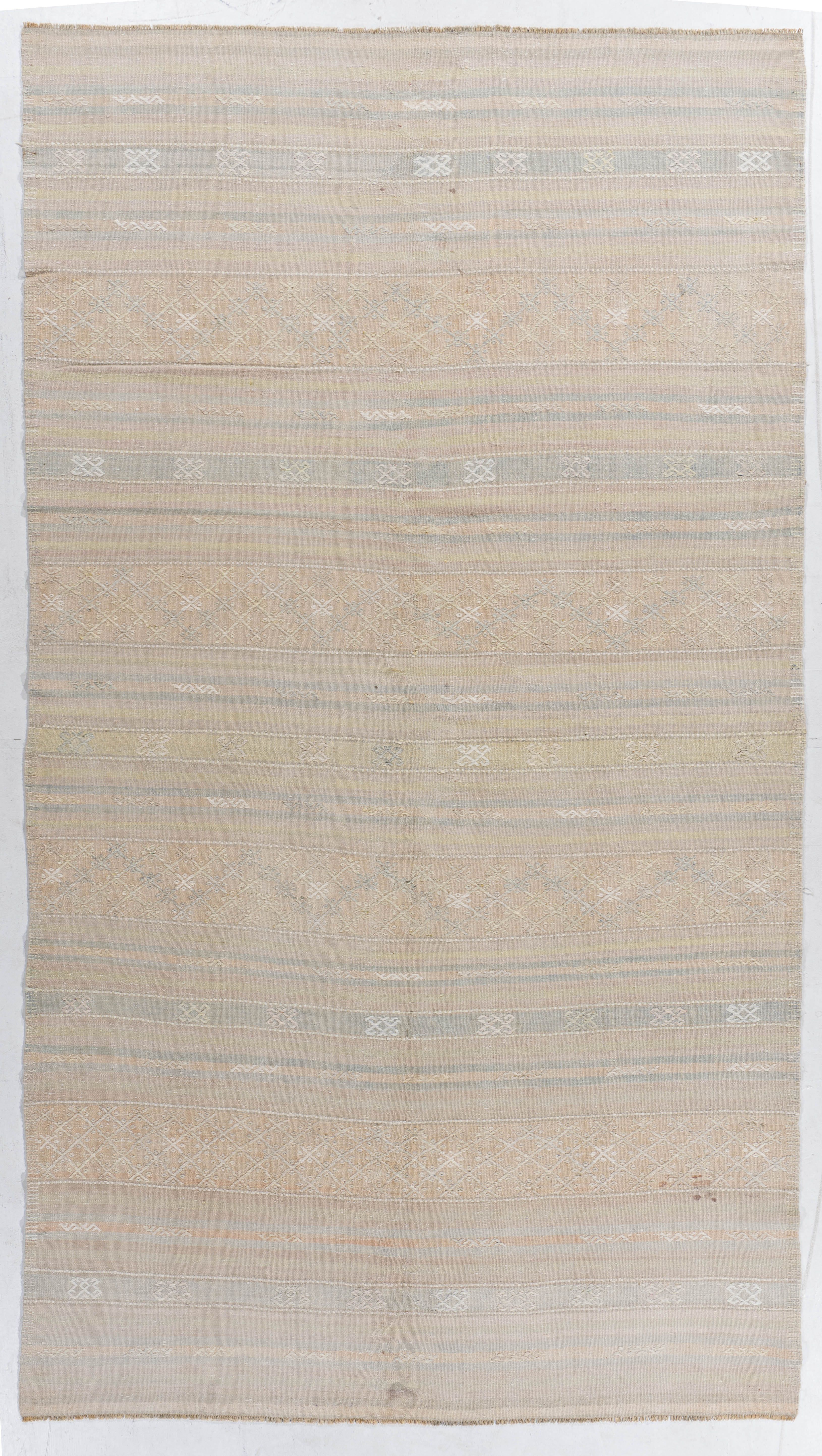 Vintage Turkish Kilim Rug 5'1 x 10'11. This vintage Turkish flat weave Kilim is hand-woven. The simplicity and boldness of this piece can also give a contemporary feel and is able to look at home in both a modern and traditional setting. The geometric design in soft colors is typical of the style woven in Turkey during this period. Colors: pale tan/light peach/blue-green.