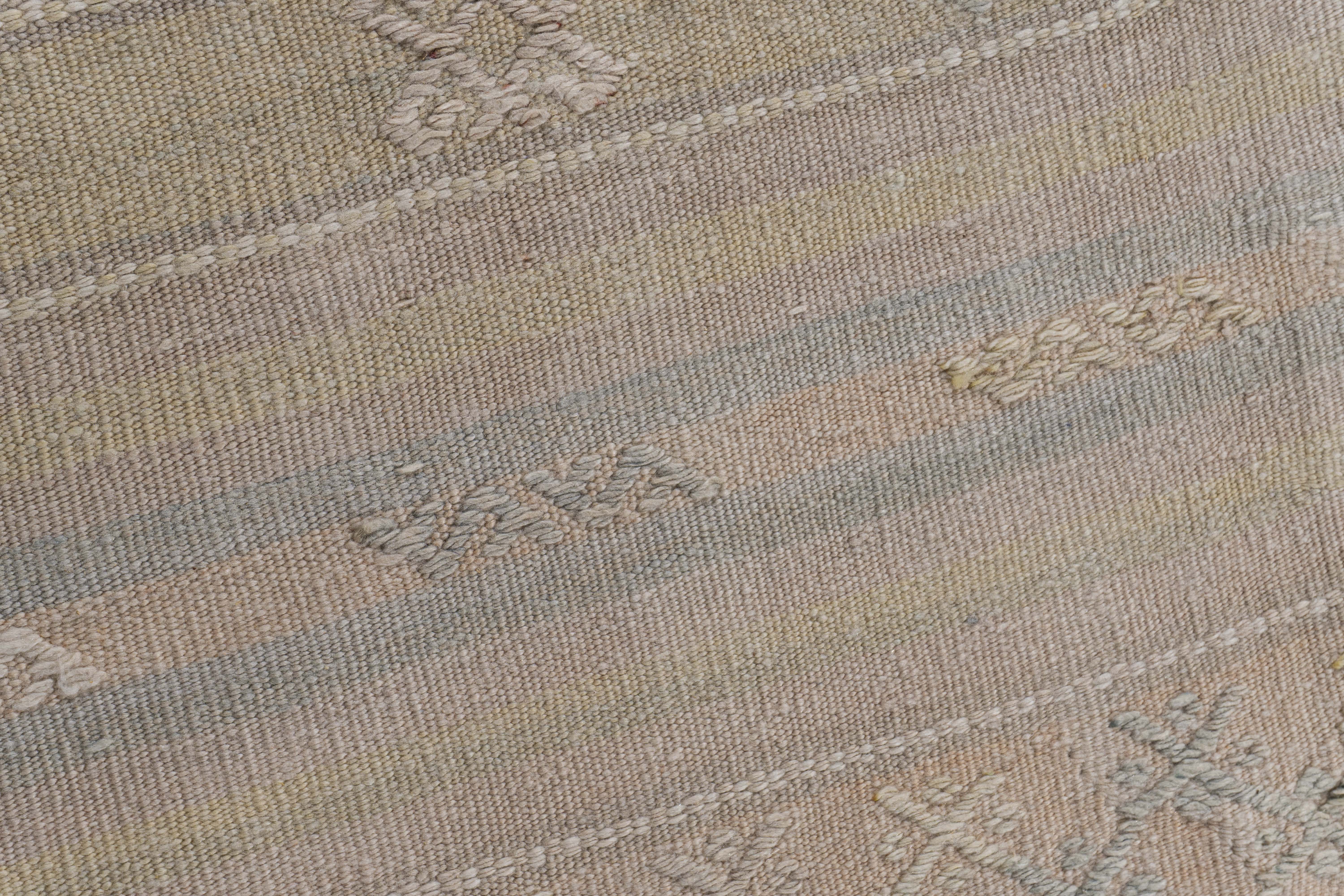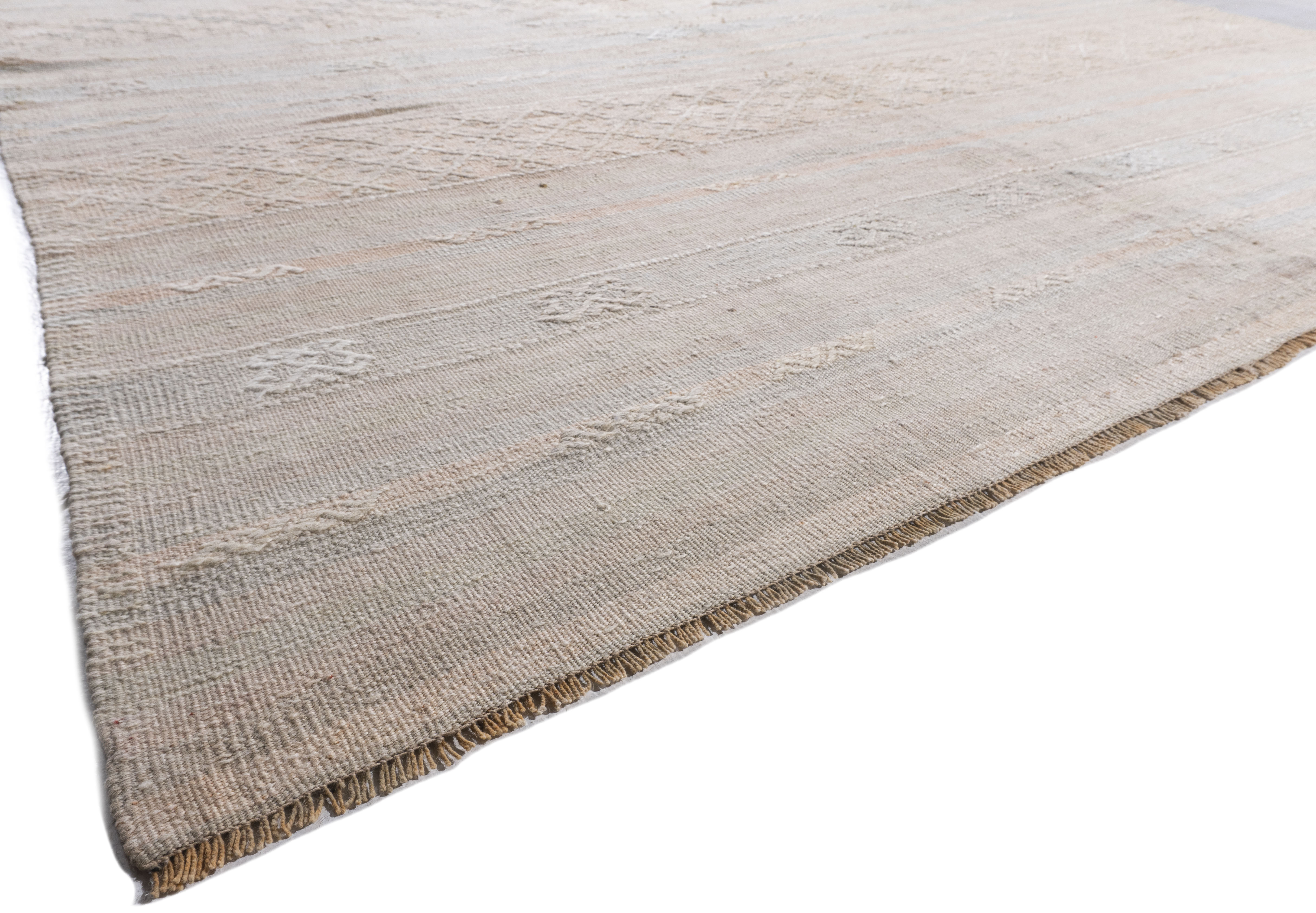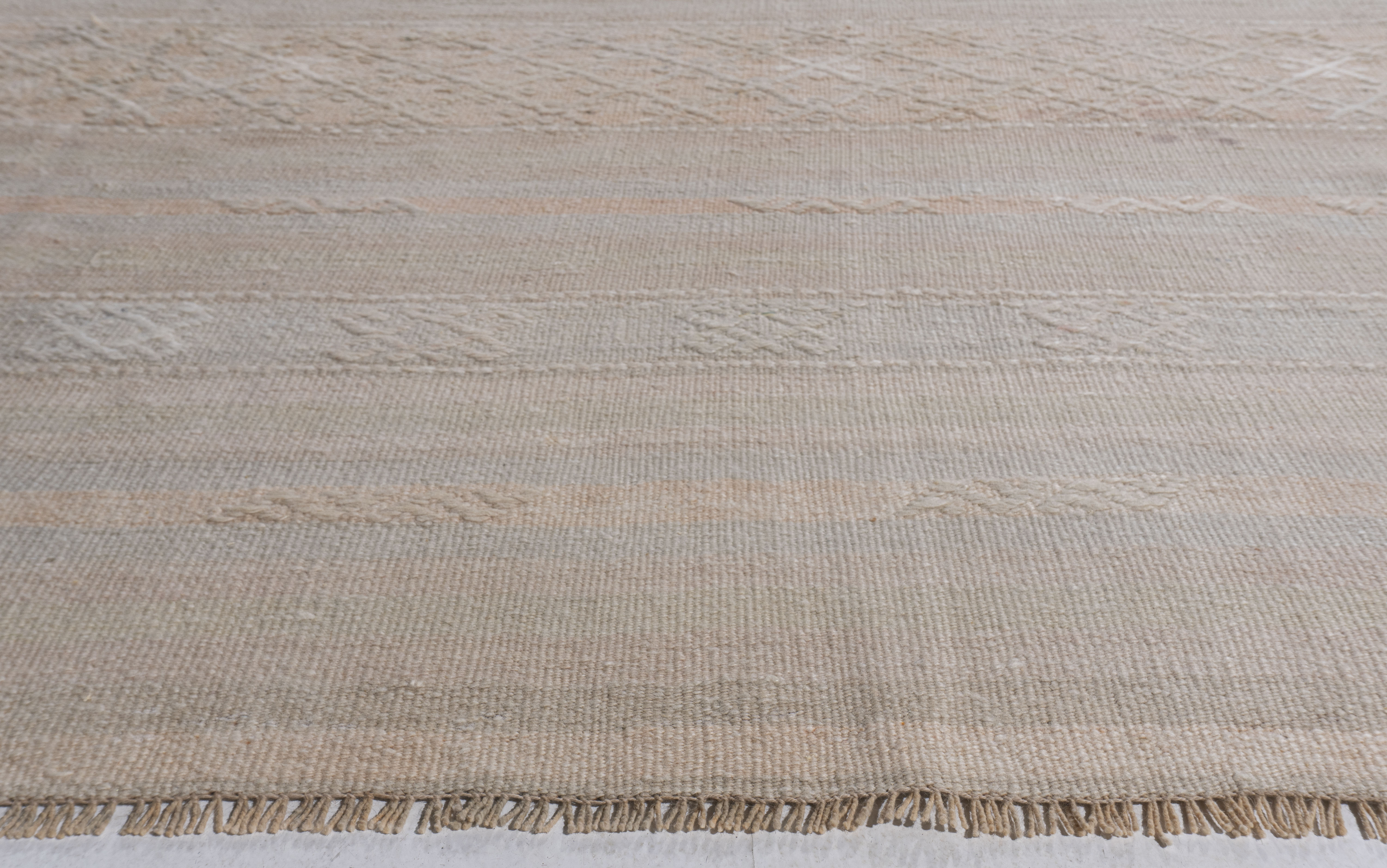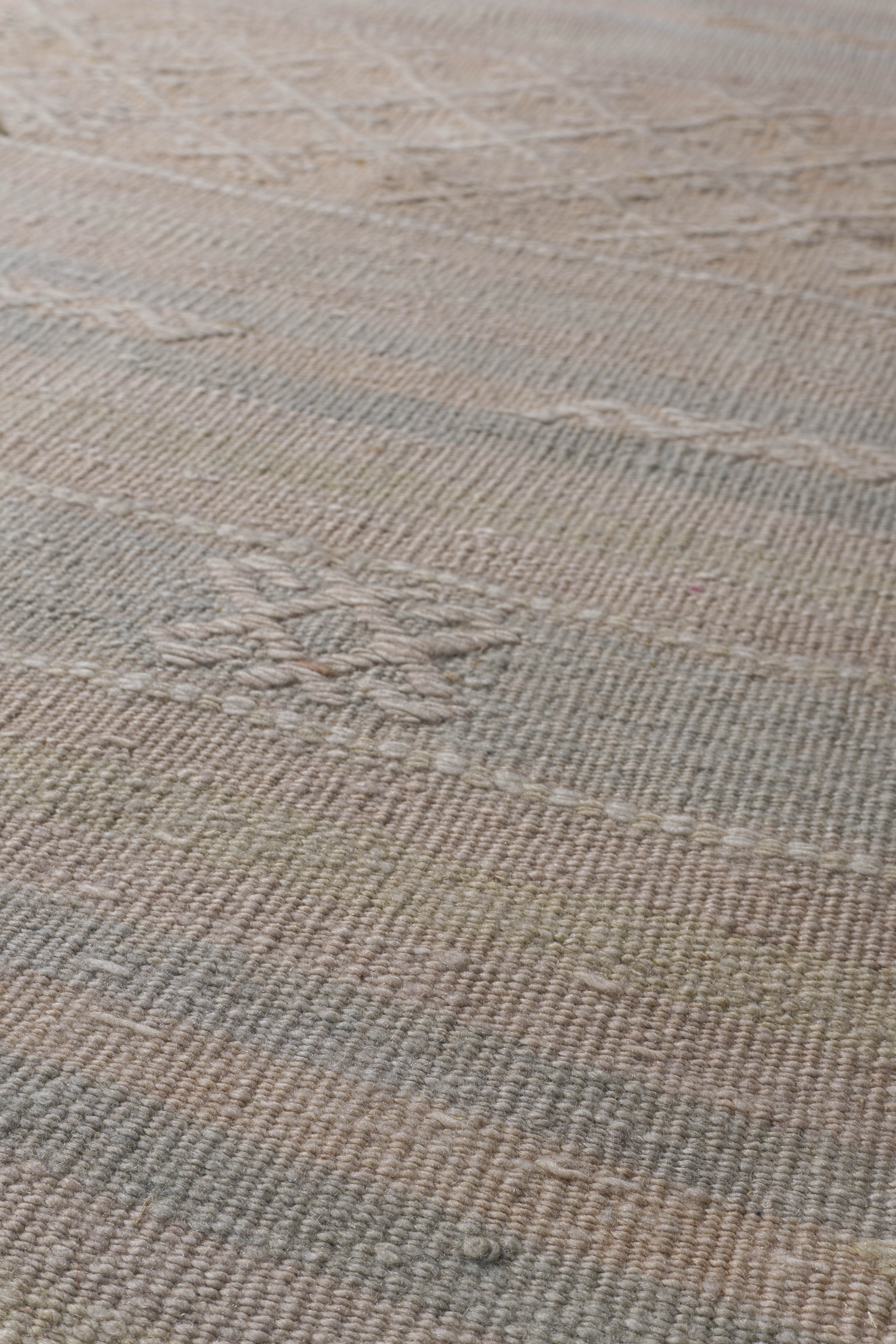 Vintage Turkish Kilim Rug 5'1 x 10'11. This vintage Turkish flat weave Kilim is hand-woven. The simplicity and boldness of this piece can also give a contemporary feel and is able to look at home in both a modern and traditional setting. The geometric design in soft colors is typical of the style woven in Turkey during this period. Colors: pale tan/light peach/blue-green.