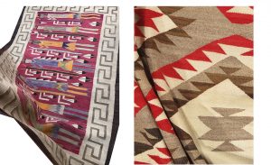 Antique Navajos are usually in scatter sizes and larger, room size pieces are both extremely rare and highly desirable . As perpetually fashionable as they are collectible, traditional Navajo rugs, skillfully woven by members of the Native American Navajo tribe, are similar to Kilims and constructed using similar time-honored techniques. The native American Navajo tribe of New Mexico and Arizona was originally weaving wearing blankets in the early 19th century, but when they became settled on the reservation they switched to rugs inspired by Caucasian pieces made available by the local traders. The strong and direct patterns are abstract and geometric, the rigorous color palette usually includes one or more natural sheep tones, and the technique is always a flat tapestry weave. Vintage Navajos give a properly informal touch to any room. Nothing is better with American Western décor.